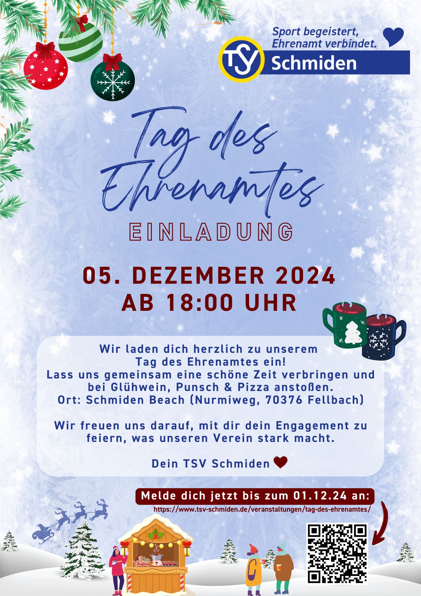 Am Donnerstag, den 05.12.2024 ab 18 Uhr gibt es ein gemütliches get-together oben am Schmiden Beach mit Glühwein, Punsch und Pizza.