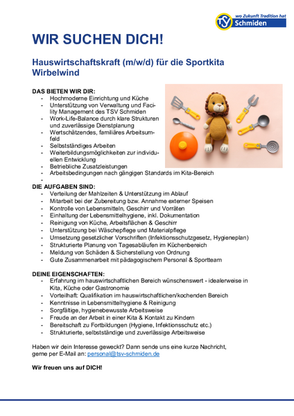 - Erfahrung im hauswirtschaftlichen Bereich wünschenswert - idealerweise in Kita, Küche oder Gastronomie